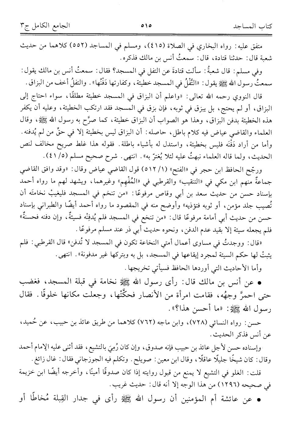 "قال: ووجدتُ في مساوي أعمال أمتي النخاعة تكون في المسجد لا تُدفن" قال القرطبي: فلم يثبتْ لها حكم السيئة لمجرد إيقاعها في المسجد، بل به ويتركها غير مدفونة". انتهى.