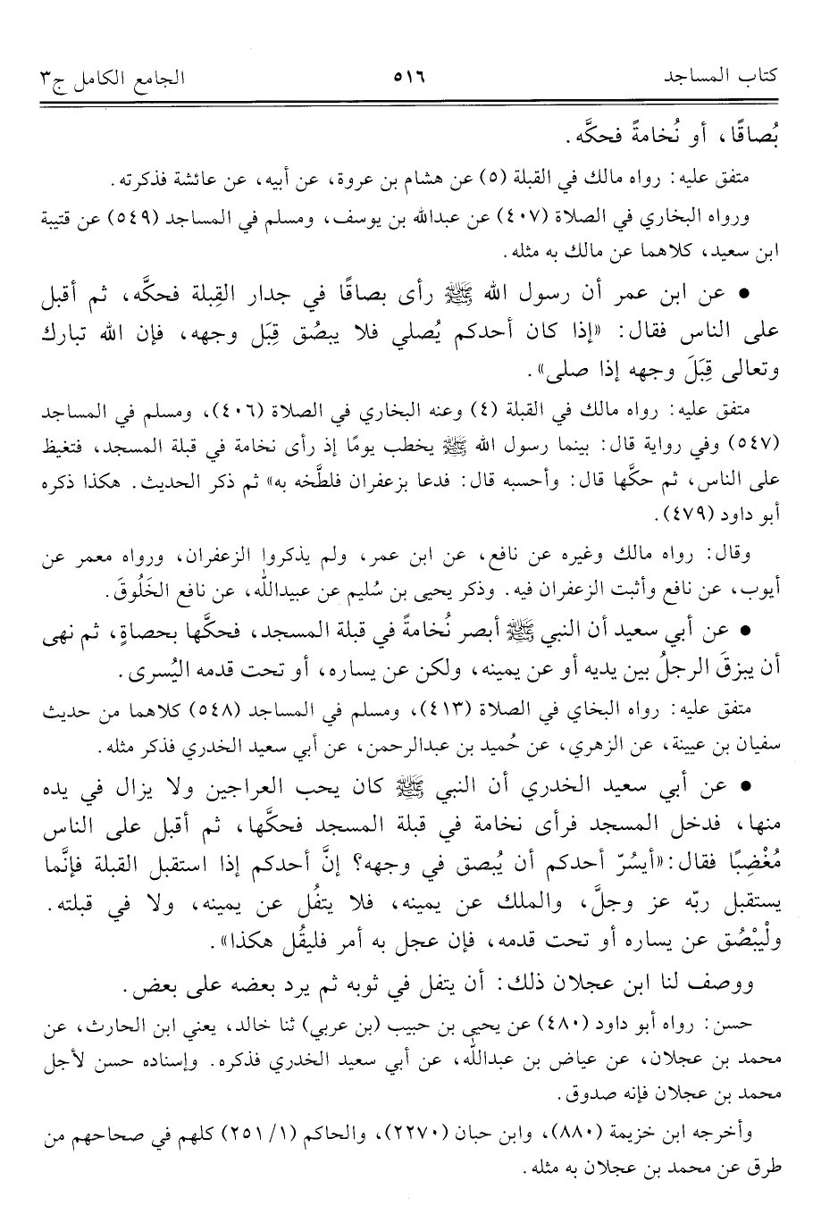 متفق عليه: رواه مالك في القبلة (٤) وعنه البخاري في الصلاة (٤٠٦)، ومسلم في المساجد (٥٤٧) وفي رواية قال: بينما رسول الله - صلى الله عليه وسلم - يخطب يومًا إذ رأي نخامة في قبلة المسجد، فتغيظ على الناس، ثم حكَّها قال: وأحسبه قال: فدعا بزعفران فلطَّخه به" ثم ذكر الحديث. هكذا ذكره أبو داود (٤٧٩).