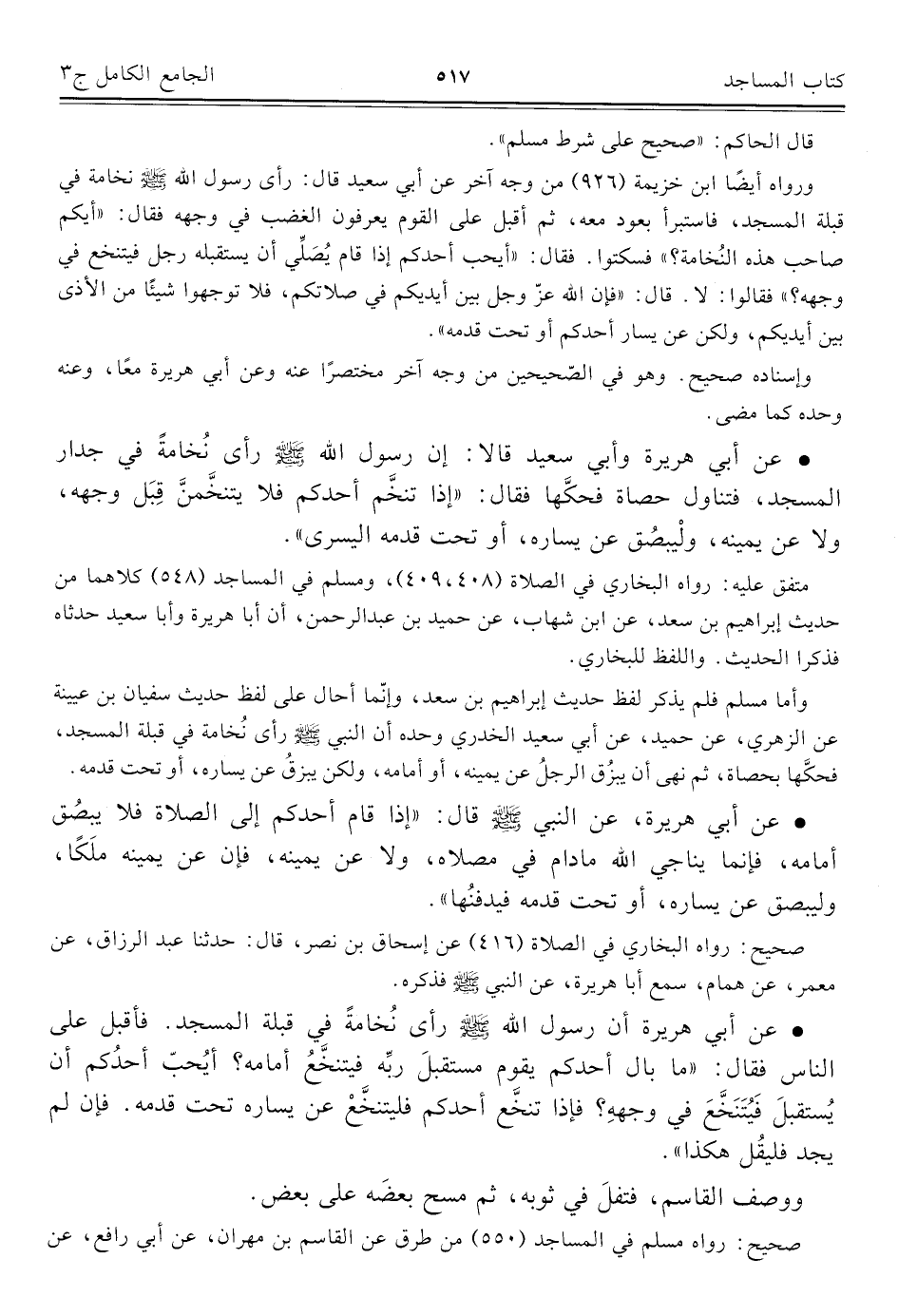 • عن أبي هريرة أن رسول الله - صلى الله عليه وسلم - رأى نُخامةً في قبلة المسجد. فأقبل على الناس فقال: "ما بال أحدكم يقوم مستقبلَ ربِّه فيتنخَّعُ أمامه؟ أيُحبّ أحدُكم أن يُستقبلَ فَيُتَنَخَّعَ في وجههِ؟ فإذا تنخَّع أحدكم فليتنخَّعْ عن يساره تحت قدمه. فإن لم يجد فليقْل هكذا".