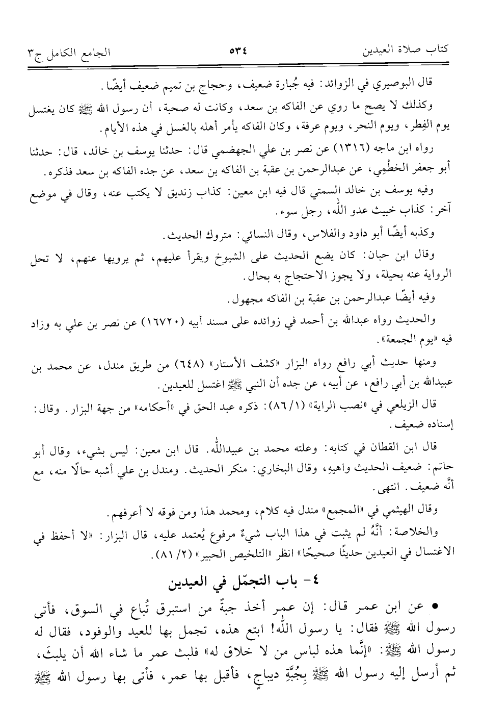 وكذلك لا يصح ما روي عن الفا كهـ بن سعد، وكانت له صحبة، أن رسول الله - صلى الله عليه وسلم - كان يغتسل يوم الفطر، ويوم النحر، ويوم عرفة، وكان الفاكه يأمر أهله بالغسل في هذه الأيام.