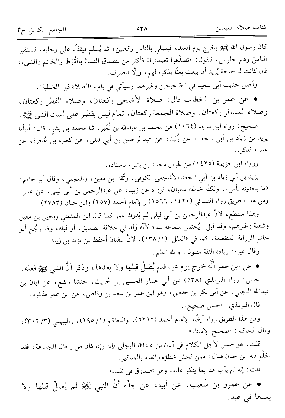 • عن عمرو بن شُعيب، عن أبيه، عن جدِّه أنَّ النَّبِيّ - صلى الله عليه وسلم - لم يُصلِّ قبلها ولا بعدها في عيد.