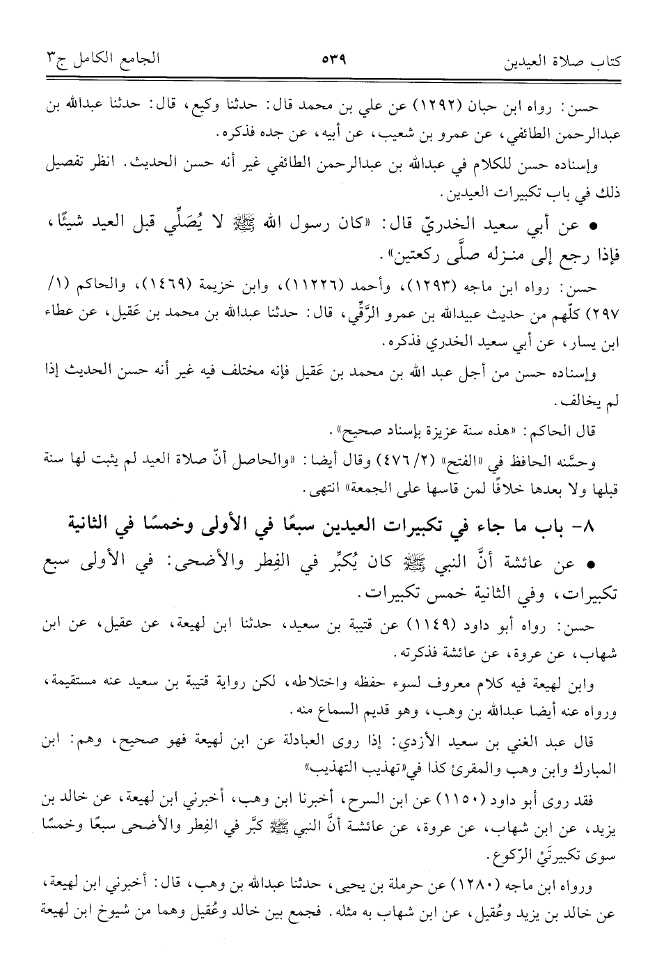• عن عائشة أن النَّبِيّ صلى الله عليه وسلم كان يُكبِّر في الفِطر والأضحى: في الأوّلى سبع تكبيرات، وفي الثانية خمس تكبيرات.