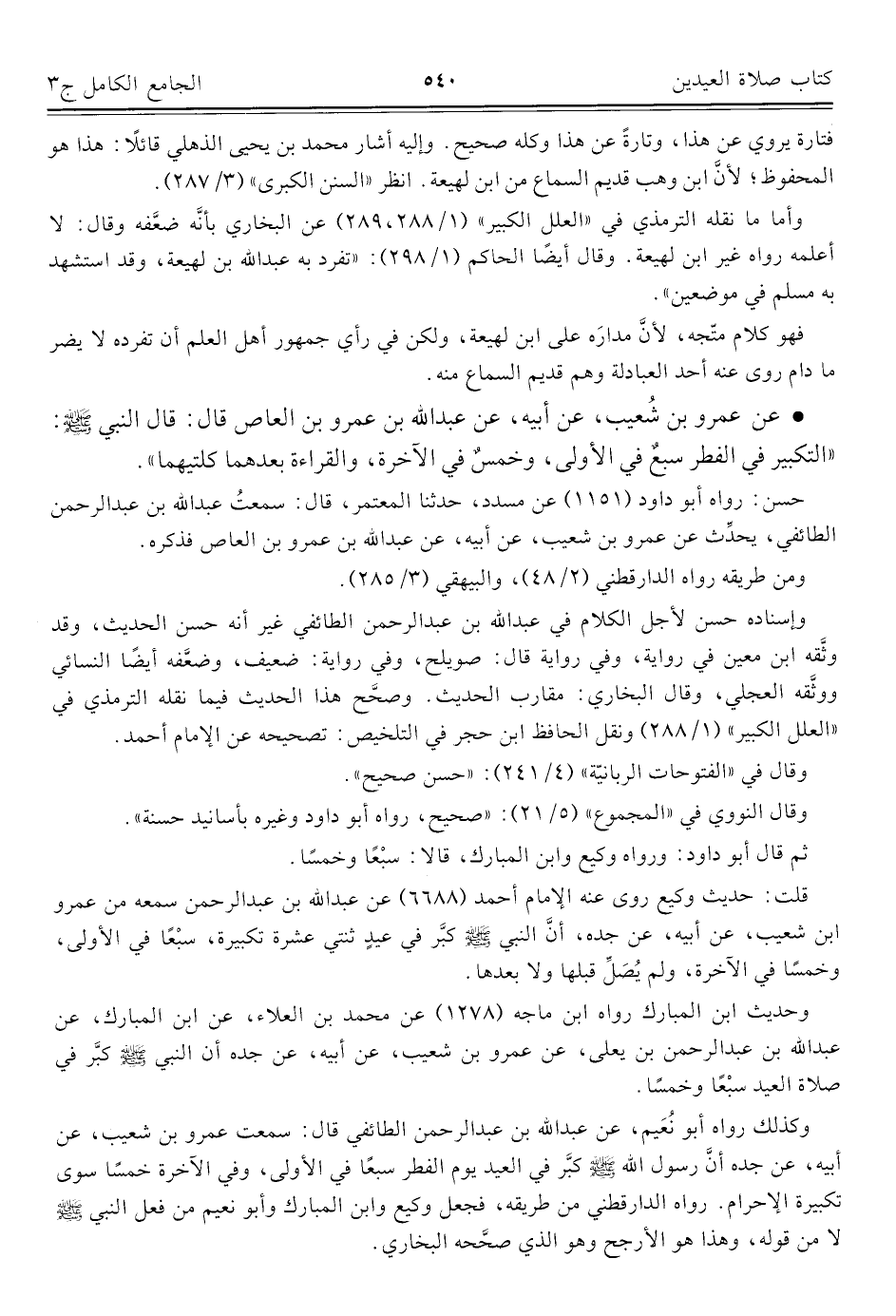 وكذلك رواه أبو نُعَيم، عن عبد الله بن عبد الرحمن الطائفي قال: سمعت عمرو بن شعيب، عن أبيه، عن جده أنَّ رسول الله - صلى الله عليه وسلم - كبَّر في العيد يوم الفطر سبعًا في الأولى، وفي الآخرة خمسًا سوي تكبيرة الإحرام. رواه الدَّارقطني من طريقه، فجعل وكيع وابن المبارك وأبو نعيم من فعل النَّبِيّ صلى الله عليه وسلم لا من قوله، وهذا هو الأرجح وهو الذي صحَّحه البخاريّ.