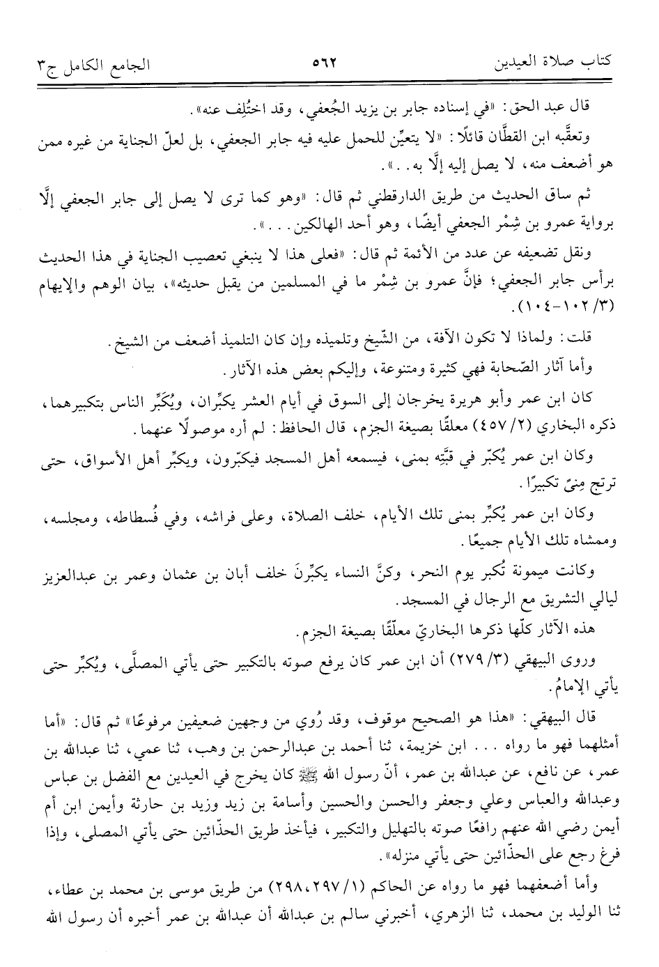 وكان ابن عمر يُكبِّر بمنى تلك الأيام، خلف الصلاة، وعلى فراشه، وفي فُسطاطه، ومجلسه، وممشاه تلك الأيام جميعًا.