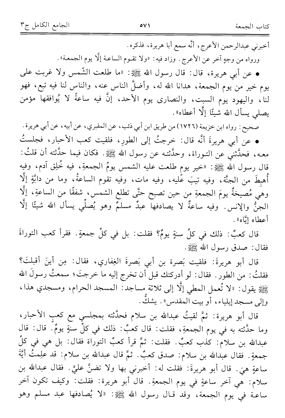 قال أبو هريرة: ثمَّ لقيتُ عبد الله بن سلام فحدَّثته بمجلسي مع كعبٍ الأحبار، وما حدَّثته به في يوم الجمعةِ، فقلت: قال كعبٌ: ذلك في كلِّ سنةٍ يومٌ. قال: قال عبد الله بن سلام: كذب كعبٌ. فقلت: ثمَّ قرأ كعبٌ التوراة فقال: بل هي في كلِّ جمعةٍ. فقال عبد الله بن سلام: صدق كعبٌ. ثمَّ قال عبد الله بن سلام: قد علِمتُ أيَّةَ ساعةٍ هيَ. قال أبو هريرةَ: فقلت له: أخبرني بها ولا تضنَّ علىَّ. فقال عبد الله بن سلام: هي آخر ساعةٍ في يوم الجمعةِ. قال أبو هريرة: فقلت: وكيف تكون آخر ساعة في يوم الجمعة، وقد قال رسول الله - صلى الله عليه وسلم -: "لا يُصادفها عبد مسلم وهو