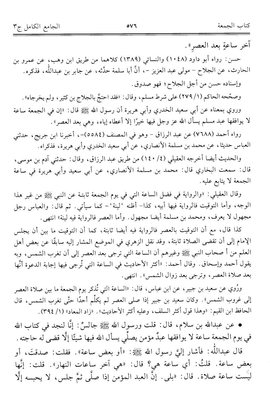 وقال العقيلي: "والرواية في فضل الساعة التي في يوم الجمعة ثابتة عن النبي - صلى الله عليه وسلم - من غير هذا الوجه، وأما التوقيت فالرواية فيها أيه، كذا -أظنه "لينة"- كما سيأتي. ثم قال: والعباس رجل مجهول لا يعرف، ومحمد بن مسلمة أيضًا مجهول. وأمَّا العصر فالرواية فيه لينة" انتهي.