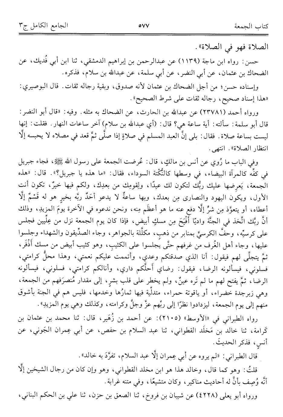 ورواه أحمد (٢٣٧٨١) عن عبد الله بن الحارث، عن الضحاك به مثله. وفيه: قال أبو النضر: قال أبو سلمة: سألته: أية ساعة هي؟ قال: (أي عبد الله بن سلام) آخر ساعات النَّهار. فقلت: إنها ليست بساعة صلاة. فقال: بلى إنَّ العبد المسلم في صلاة إذا صلَّى ثم قعد في مصلاه لا يحبسه إلَّا انتظار الصلاة". انتهي.