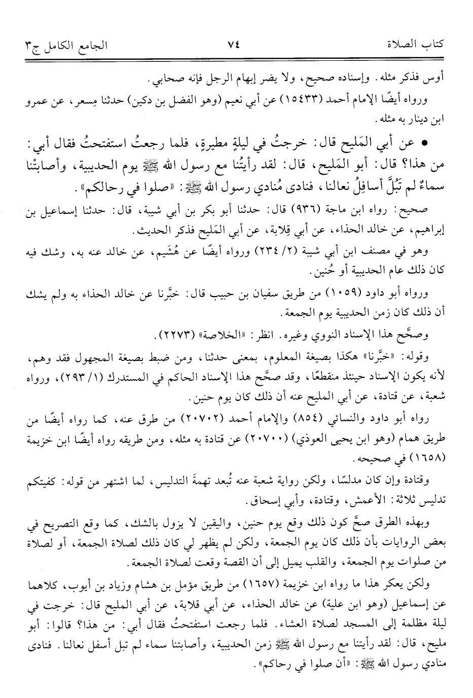 ولكن يعكر هذا ما رواه ابن خزيمة (١٦٥٧) من طريق مؤمّل بن هشام وزياد بن أيوب، كلاهما عن إسماعيل (وهو ابن علية) عن خالد الحذاء، عن أبي قلابة، عن أبي المليح قال: خرجت في ليلة مظلمة إلى المسجد لصلاة العشاء، فلمّا رجعت استفتحتُ فقال أبي: من هذا؟ قالوا: أبو مليح، قال: لقد رأيتنا مع رسول الله - صلى الله عليه وسلم - زمن الحديبية، وأصابتنا سماء لم تبل أسفل نعالنا. فنادى منادي رسول الله - صلى الله عليه وسلم -: "أن صلوا في رحاكم".