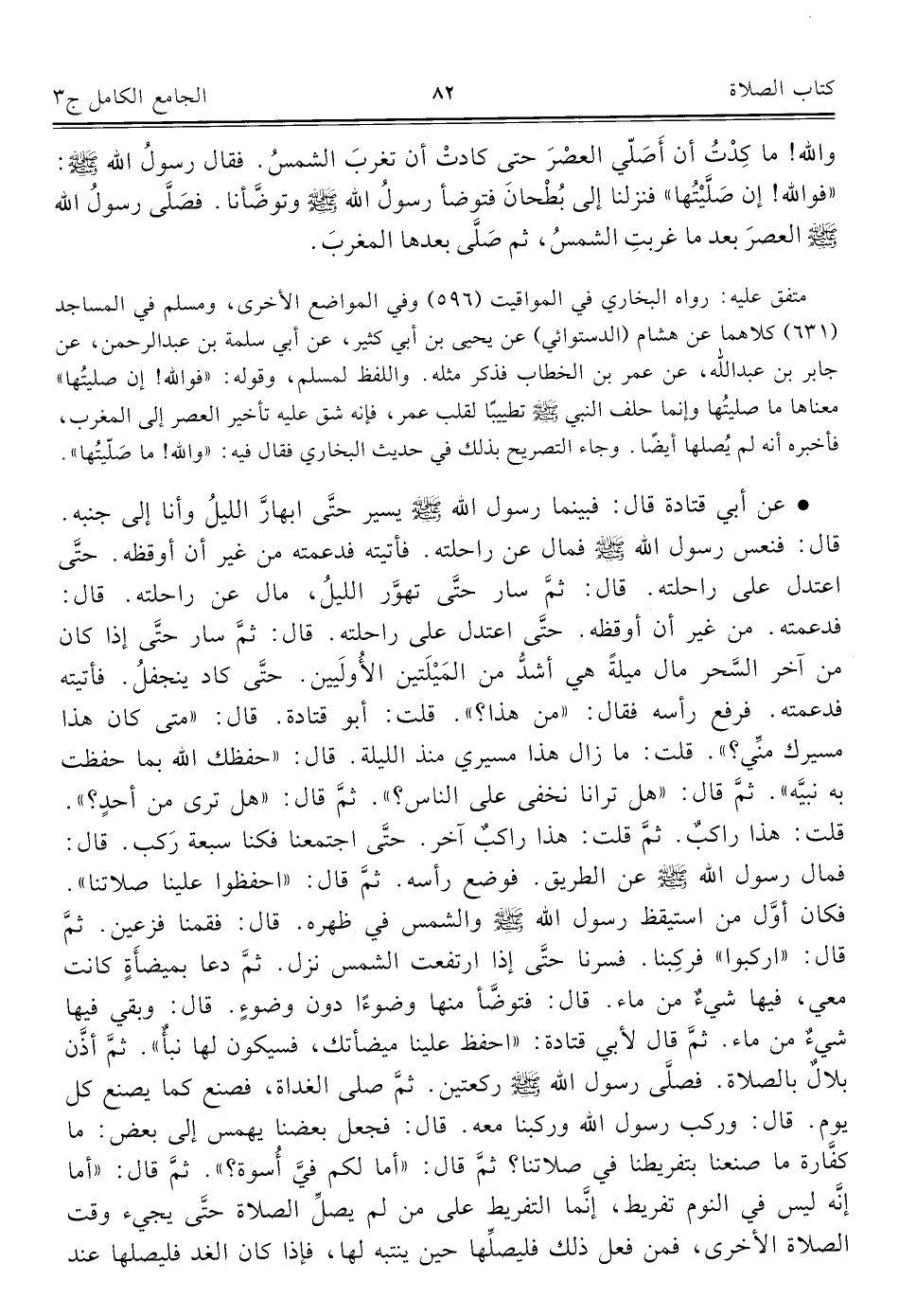 • عن أبي قتادة قال: فبينما رسول الله - صلى الله عليه وسلم - يسير حتَّى ابهارَّ الليلُ وأنا إلى جنبه. قال: فنعس رسول الله - صلى الله عليه وسلم - فمال عن راحلته. فأتيته فدعمته من غير أن أوقظه. حتَّى اعتدل على راحلته. قال: ثمَّ سار حتَّى تهوَّر الليلُ، مال عن راحلته. قال: فدعمته. من غير أن أوقظه. حتَّى اعتدل على راحلته. قال: ثمَّ سار حتَّى إذا كان من آخر السَّحر مال ميلةً هي أشدُّ من المَيْلَتين الأُولَيين. حتَّى كاد ينجفلُ. فأتيته فدعمته. فرفع رأسه فقال: "من هذا؟ ". قلت: أبو قتادة. قال: "متى كان هذا مسيرك منِّي؟ ". قلت: ما زال هذا مسيري منذ الليلة. قال: "حفظك الله بما حفظت به نبيَّه". ثمَّ قال: "هل ترانا نخفي على الناس؟ ". ثمَّ قال: "هل ترى من أحدٍ؟ ". قلت: هذا راكبٌ. ثمَّ قلت: هذا راكبٌ آخر. حتَّى اجتمعنا فكنا سبعة رَكب. قال: فمال رسول الله صلى الله عليه وسلم عن الطريق، فوضع رأسه. ثمَّ قال: "احفظوا علينا صلاتنا". فكان أوَّل من استيقظ رسول الله - صلى الله عليه وسلم - والشمس في ظهره. قال: فقمنا فزعين. ثمَّ قال: "اركبوا" فركِبنا. فسرنا حتَّى إذا ارتفعت الشمس نزل. ثمَّ دعا بميضأَةٍ كانت معي، فيها شيءٌ من ماء. قال: فتوضَّأ منها وضوءًا دون وضوءٍ. قال: وبقي فيها شيءٌ من ماء. ثمَّ قال لأبي قتادة: "احفظ علينا ميضأتك، فسيكون لها نبأٌ". ثمَّ أذَّن بلالٌ بالصلاة. فصلَّى رسول الله - صلى الله عليه وسلم - ركعتين. ثمَّ صلى الغداة، فصنع كما يصنع كل يوم. قال: وركب رسول الله وركبنا معه. قال: فجعل بعضنا يهمس إلى بعض: ما كفارة ما صنعنا بتفريطنا في صلاتنا؟ ثمَّ قال: "أما لكم فيَّ أسوة؟ ". ثمَّ قال: "أما إنه ليس في النوم تفريط، إنَّما التفريط على من لم يصلِّ الصلاة حتَّى يجيء وقت الصلاة الأخرى، فمن فعل ذلك فليصلِّها حين ينتبه لها، فإذا كان الغد فليصلها عند