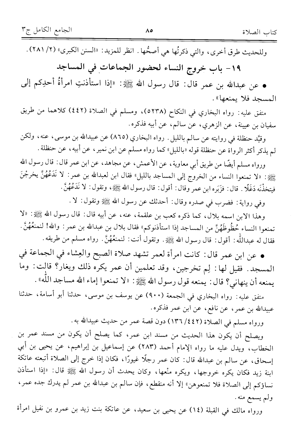 • عن عبد الله بن عمر قال: قال رسول الله - صلى الله عليه وسلم -: "إذا استأذنتِ امرأةُ أحدِكم إلى المسجد فلا يمنعها".