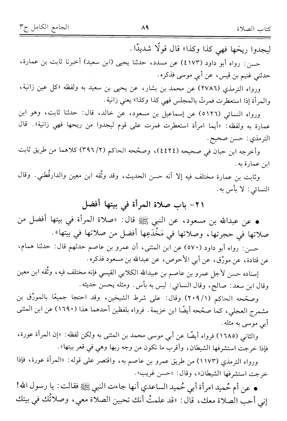 • عن عبد الله بن مسعود، عن النبي صلى الله عليه وسلم قال: "صلاة المرأة في بيتها أفضل من صلاتها في حجرتها، وصلاتها في مَخْدَعِها أفضل من صلاتها في بيتها".