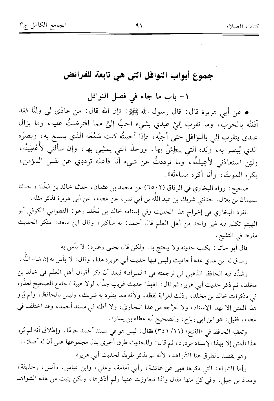 • عن أبي هريرة قال: قال رسول الله - صلى الله عليه وسلم -: "إن الله قال: من عادَى لي وليًّا فقد آذنتُه بالحرب، وما تقرب إليَّ عبدي بشيء أحبَّ إليَّ مما افترضتُ عليه، وما يزال عبدي يتقرب إلي بالنوافل حتَّى أحِبَّه، فإذا أحببتُه كنت سَمْعَه الذي يسمع به، وبصرَه الذي يُبصر به، ويَده التي يبطِشُ بها، ورجلَه التي يمشِي بها، وإن سألني لأُعْطِينَّه، ولئِن استعاذني لأعِيذنَّه، وما ترددتُّ عن شيء أنا فاعله ترددِي عن نفس المؤمن، يكره الموتَ، وأنا أكره مساءتَه".