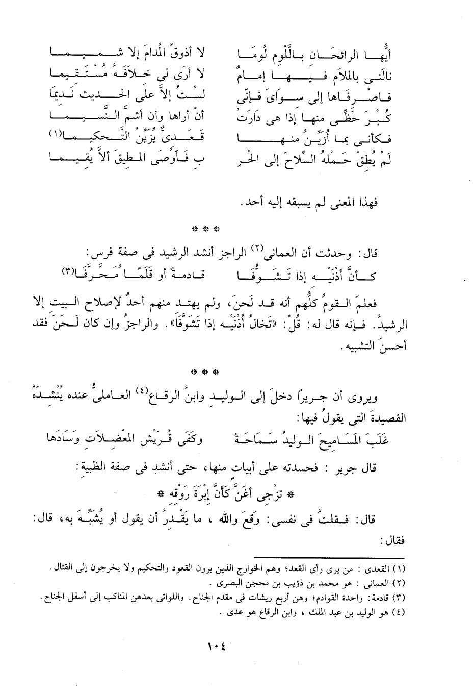 فعلم القوم كلهم أنه قد لحن، ولم يهتد منهم أحد لإصلاح البيت إلا الرشيد. فإنه قال له: قل: تخال أذنيه إذا تشوفا. والراجز وإن كان لحن فقد أحسن التشبيه.