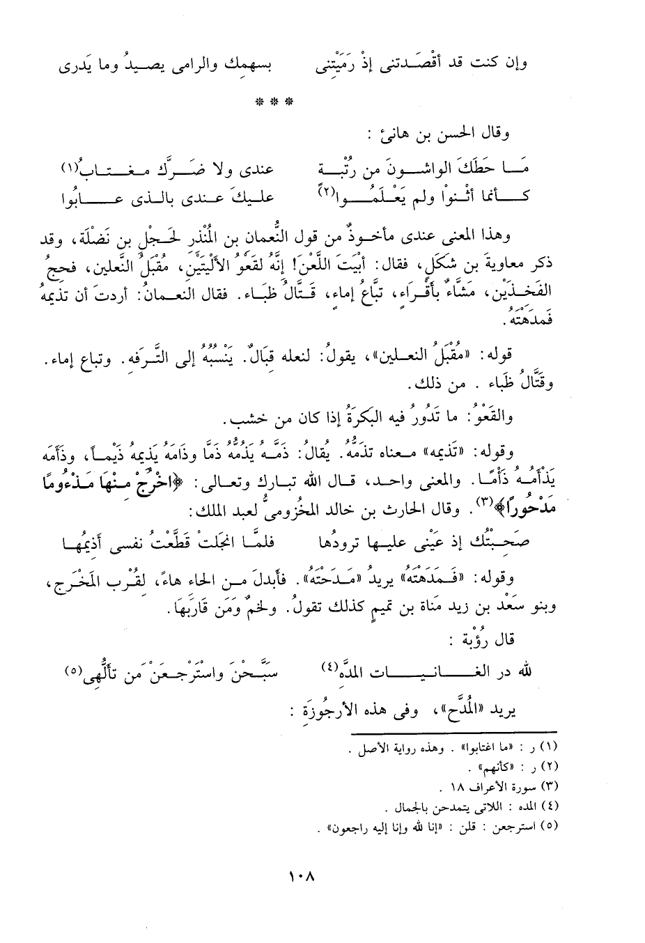 وهذا المعنى عندي مأخوذ من قول النعمان بن المنذر لحجل بن نضلة، وقد ذكر معاوية بن شكل، فقال: أبيت اللعن! إنه لقعو الأليتين، مقبل النعلين، فجج الفخذين، مشاء بأقراء، تباع إماء، قتال ظبآء. فقال النعمان: أردت أن تذيمه فمدهته.