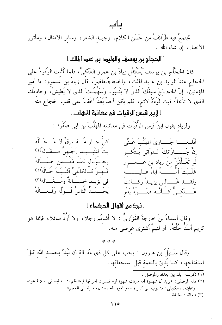باب تجتمع فيه طرائف من حسن الكلام، وجيد الشعر، وسائر الأمثال، ومأثور الأخبار، إن شاء الله.