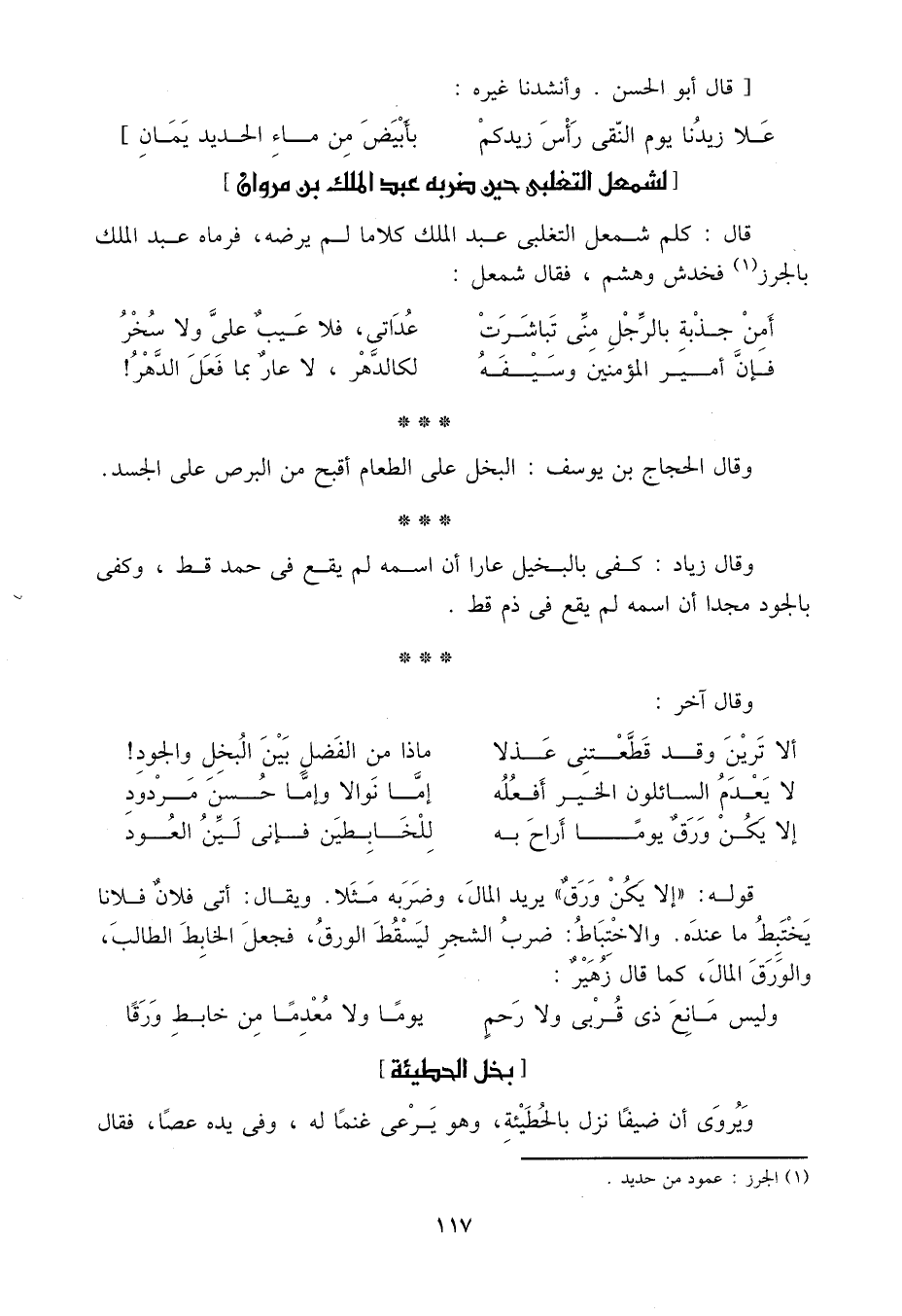 وقال زياد: كفى بالبخيل عاراً أن اسمه لم يقع في حمد قط، وكفى بالجواد مجداً أن اسمه لم يقع في ذم قط.