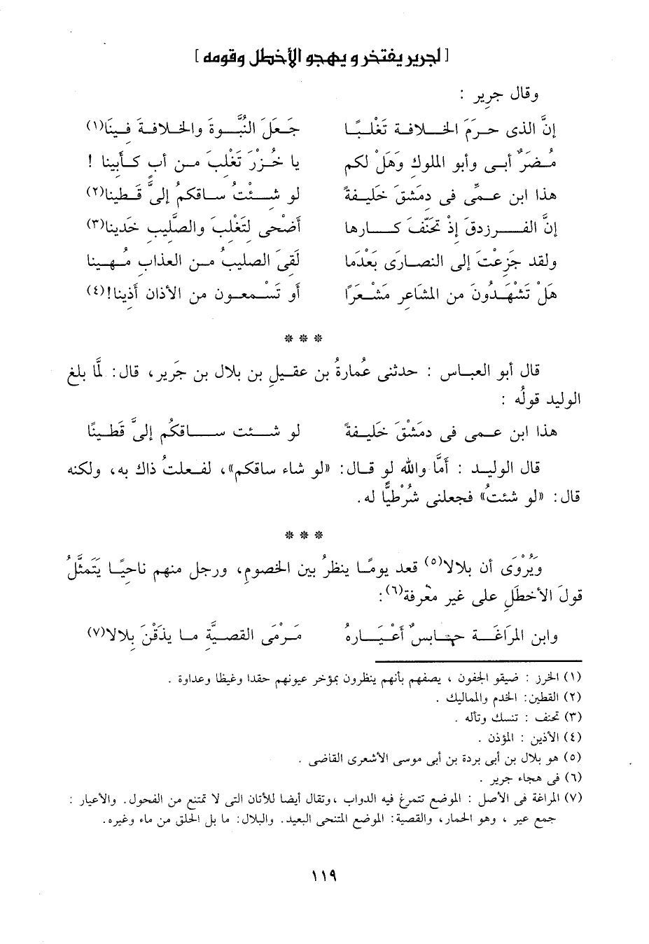 ويروى أن بلالاً5 قعد يوماً ينظر بين الخصوم، ورجل منهم ناحياً يتمثل قول الأخطل على غير معرفة6: