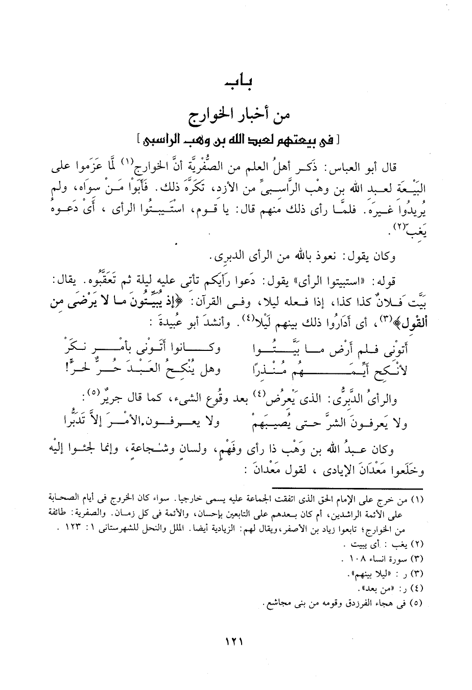 قال أبو العباس: ذكر أهل العلم من الصفرية أن الخوارج1 لما عزموا على البيعة لعبد الله بن وهب الراسبي من الأزد، تكره ذلك، فأبوا من سواه، ولم يريدوا غيره. فلما رأى ذلك منهم قال: يا قوم، استبيتوا الرأي، أي دعوه يغب2.