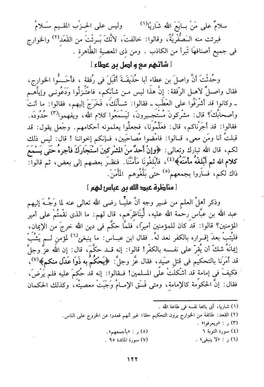 وحدثت أن واصل بن عطاء أبا حذيفة أقبل في رفقة، فأحسوا الخوارج، فقال واصل لأهل الرفقة: إن هذا ليس من شأنكم، فاعتزلوا ودعوني وإياهم - وكانوا قد أشرفوا على العطب - فقالوا: شأنك. فخرج إليهم، فقالوا: ما أنت وأصحابك? قال: مشركون مستجيرون ليسمعوا كلام الله، ويفهموا1 حدوده. فقالوا: قد أجرناكم، قال: فعلمونا. فجعلوا يعلمونه أحكامهم، وجعل يقول: قد قبلت أنا ومن معي، قالوا: فامضوا مصاحبين، فإنكم إخواننا! قال: ليس ذلك لكم، قال الله تبارك وتعالى: {وَإِنْ أَحَدٌ مِنَ الْمُشْرِكِينَ اسْتَجَارَكَ فَأَجِرْهُ حَتَّى يَسْمَعَ كَلامَ اللَّهِ ثُمَّ أَبْلِغْهُ مَأْمَنَهُ} 2، فأبلغونا مأمننا. فنظر بعضهم إلى بعض، ثم قالوا: ذاك لكم، فساروا بجمعهم3 حتى بلغوهم المأمن.