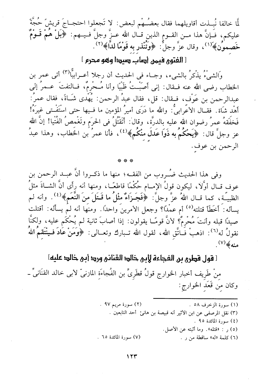 من طريف أخبار الخوارج قول قطري بن الفجاءة المازني لأبي خالد القناني وكان من قعد الخوارج: