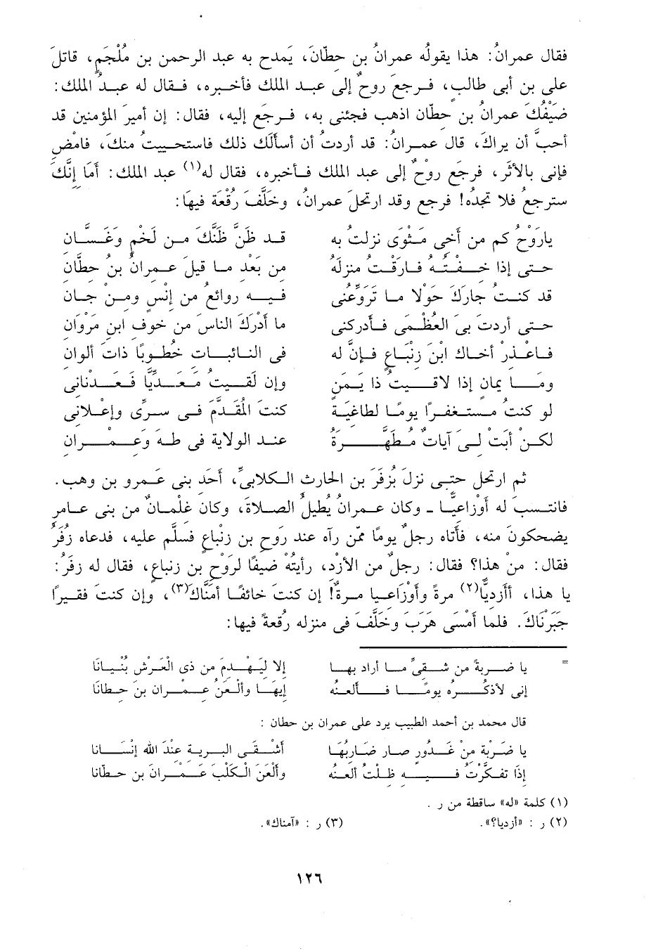 فقال عمران: هذا يقوله عمران بن حطان، يمدح به عبد الرحمن بن ملجم، قاتل علي بن أبي طالب، فرجع روح إلى عبد الملك فأخبره، فقال له عبد الملك: ضيفك عمران بن حطان، إذهب فجئني به، فرجع إليه، فقال: إن أمير المؤمنين قد أحب أن يراك، قال عمران: قد أردت أن أسألك ذلك فاستحييت منك، فامض فإني بالأثر، فرجع روح إلى عبد الملك فأخبره، فقال له1 عبد الملك: أما إنك سترجع فلا تجده! فرجع وقد ارتحل عمران، وخلف رقعة فيها: