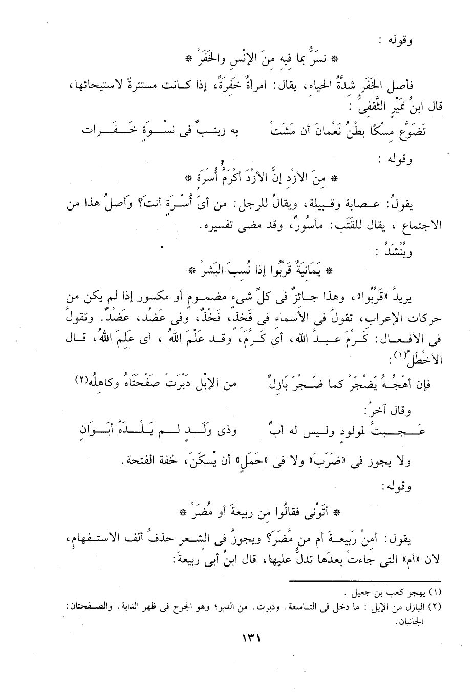 يريد قربوا وهذا جائز في كل شيء مضموم أو مكسور إذا لم يكن من حركات الإعراب، تقول في الأسماء في فخذ، وفي عضد، عضد، وتقول في الأفعال: كرم عبد الله، أي كرم، وقد علم الله، أي علم الله، قال الأخطل1: