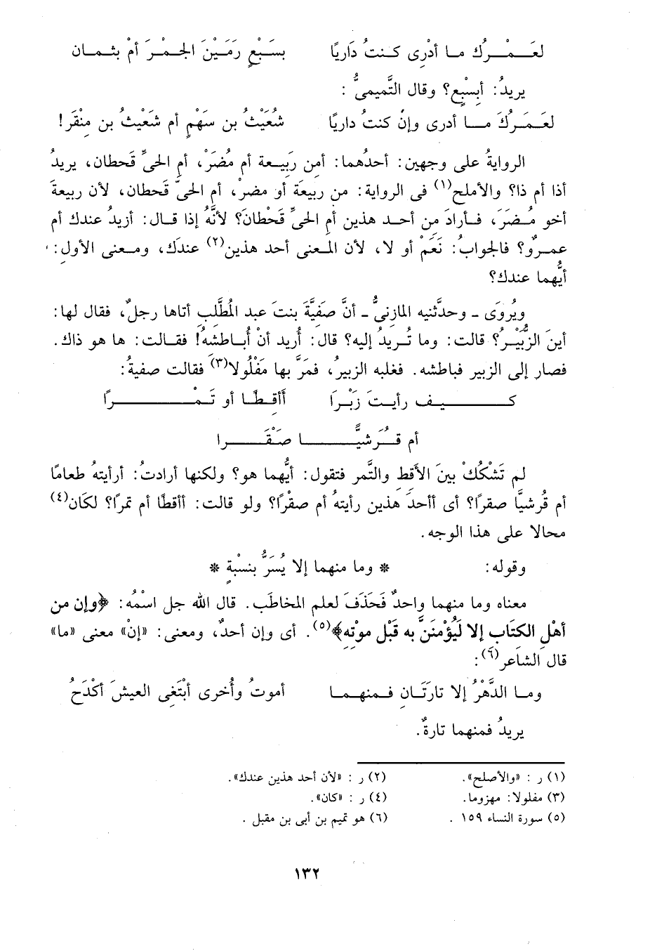 معناه وما منها واحد، فحذف لعلم المخاطب، قال الله جل اسمه: {وَإِنْ مِنْ أَهْلِ الْكِتَابِ إِلَّا لَيُؤْمِنَنَّ بِهِ قَبْلَ مَوْتِهِ} 5. أي وإن أحد ومعنى إن معنى ما، قال الشاعر6: