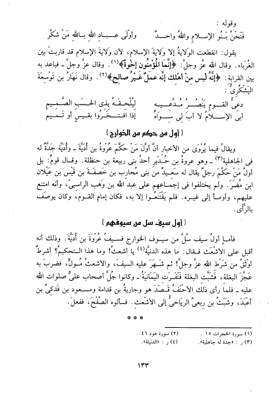 فأما أول سيف سل من سيوف الخوارج فسيف عروة بن أدية. وذلك أنه أقبل على الأشعث فقال: ما هذه الدنية1 يا أشعث! وما هذا التحكيم? أشرط أوثق من شرط الله عز وجل! ثم شهر عليه السيف، والأشعث مول، فضرب به عجز البغلة، فشبت البغلة فنفرت اليمانية - وكان جل أصحاب علي صلوات الله عليه - فلما رأى ذلك الأحنف قصد هو وجارية بن قدامة ومسعود بن فدكي بن أعبد، وشبث بن ربعي الرياحي إلى الأشعث. فسألوه الصفح، ففعل.