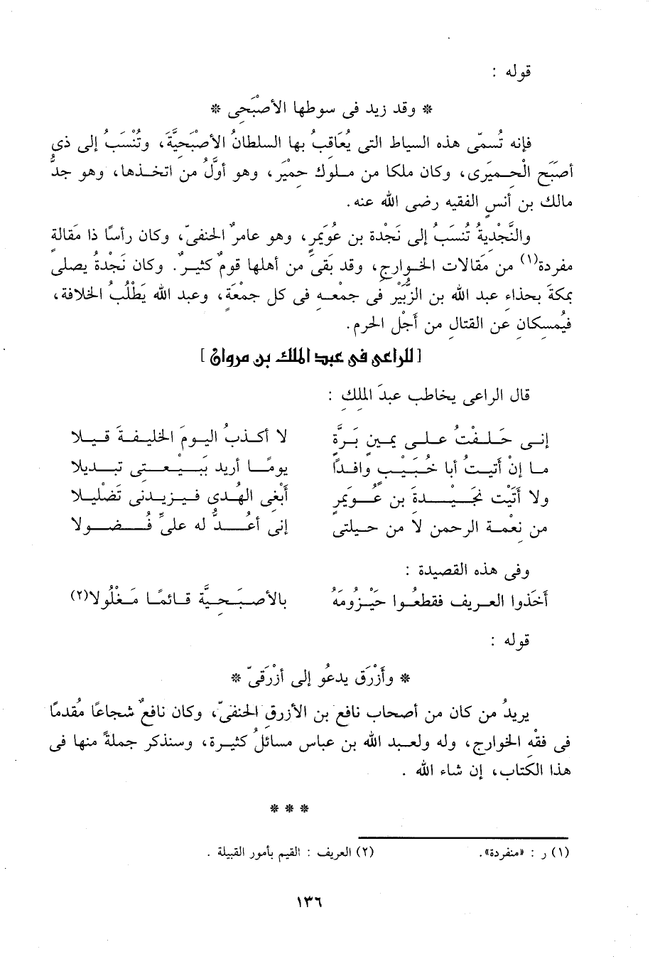يريد من كان من أصحاب نافع بن الأزرق الحنفي، وكان نافع شجاعاً مقدماً في فقه الخوارج، وله ولعبد الله بن عباس مسائل كثيرة، وسنذكر جملة منها في هذا الكتاب، إن شاء الله.