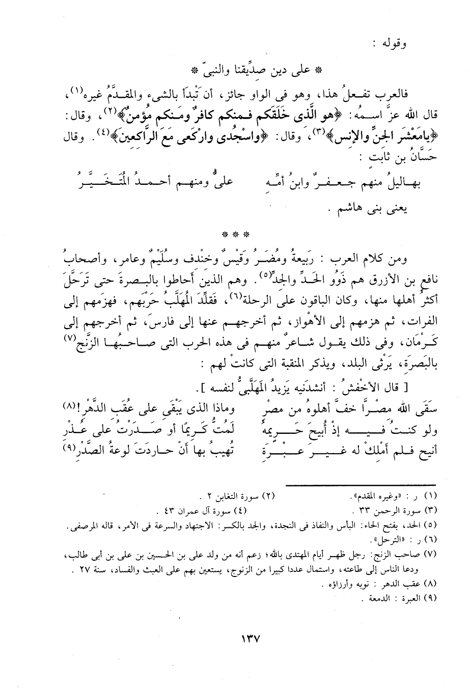 ومن كلام العرب: ربيعة ومضر وقيس وخندف وسليم وعامر، وأصحاب نافع بن الأزرق هم ذوو الحد والجد5. وهم الذي أحاطوا بالبصرة حتى ترحل أكثر أهلها منها، وكان الباقون على الرحلة6، فقلد المهلب حربهم، فهزمهم إلى الفرات، ثم هزمهم إلى الأهواز، ثم أخرجهم عنها إلى فارس، ثم أخرجهم إلى كرمان، وفي ذلك يقول شاعر منهم في هذه الحرب التي صاحبها الزنج7 بالبصرة، يرثي البلد، ويذكر المنقبة التي كانت لهم: