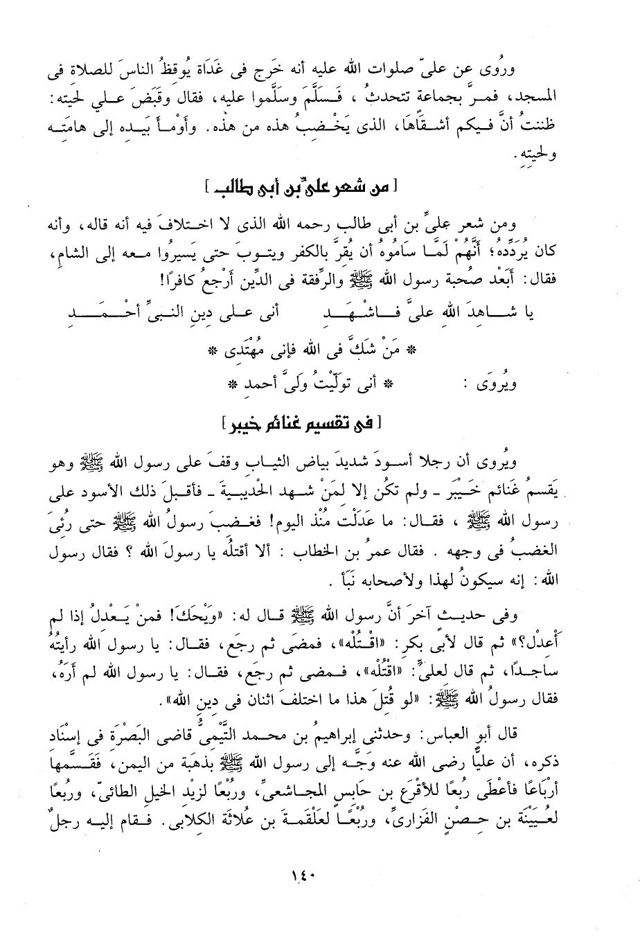 قال أبو العباس: وحدثني إبراهيم بن محمد التميمي قاضي البصرة في إسناد ذكره، أن علياً رضي الله عنه وجه إلى رسول الله صَلَّى اللَّهُ عَلَيْهِ وَسَلَّمَ بذهبة من اليمن، فقسمها أرباعاً فأعطى ربعاً للأقرع بن حابس المجاشعي، وربعاً لزيد الخيل الطائي، وربعاً لعيينة بن حصن الفزاري، وربعاً لعلقمة بن علاقة الكلابي. فقام إليه رجل