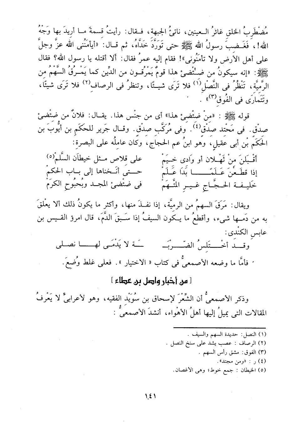 قوله صَلَّى اللَّهُ عَلَيْهِ وَسَلَّمَ: "من ضئضئ هذا" أي من جنس هذا. يقال: فلان من ضئضئ صدق، في محتد صدق4، وفي مركب صدق. وقال جرير للحكم بن أيوب بن الحكم بن أبي عقيل، وهو ابن عم الحجاج، وكان عامله على البصرة:
