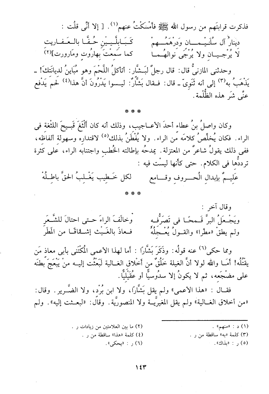 فقال: هذا الأعمى ولم يقل بشاراً، ولا ابن برد، ولا الضرير. وقال: من أخلاق الغالية ولم يقل المغيرية ولا المنصورية. وقال: لبعثت إليه، ولم