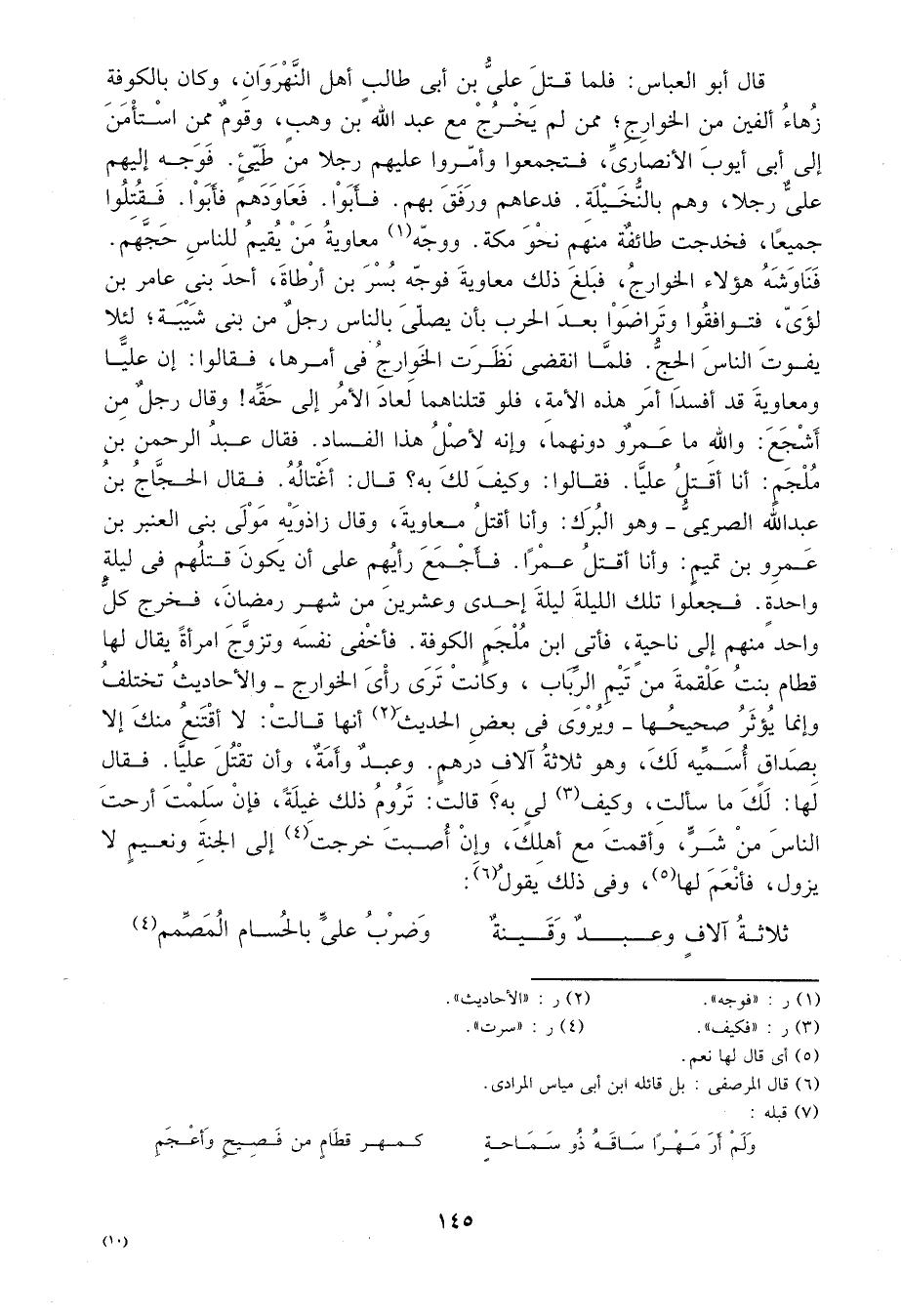 ثم نرجع إلى ذكر الخوارج. قال أبو العباس: فلما قتل علي بن أبي طالب أهل النهروان، وكان بالكوفة زهاء ألفين من الخوارج؛ ممن لم يخرج مع عبد الله بن وهب، وقوم ممن استأمن إلى أبي أيوب الأنصاري، فتجمعوا وأمروا عليهم رجلاً من طيئ، فوجه إليهم علي رجلاً، وهم بالنخيلة، فدعاهم ورفق بهم، فأبوا، فعاودهم فأبوا، فقتلوا جميعاً، فخرجت طائفة منهم نحو مكة، ووجه1 معاوية من يقيم للناس حجهم، فناوشه هؤلاء الخوارج، فبلغ ذلك معاوية ووجه معاوية بسر بن أرطأة، أحد بن عامر بن لؤي، فتوافقوا وتراضوا بعد الحرب بأن يصلي بالناس رجل من بني شيبة، لئلا يفوت الناس الحج، فلما انقضى نظرت الخوارج في أمرها، فقالوا: إن علياً ومعاوية قد أفسدا أمر هذه الأمة، فلو قتلناهما لعاد الأمر إلى حقه! وقال رجل من أشجع: والله ما عمرو دونهما، وإنه لأصل هذا الفساد، فقال عبد الرحمن بن ملجم: أنا أقتل علياً، فقالوا: وكيف لك به? قال: أغتاله. فقال الحجاج بن عبد الله الصريمي - وهو البرك: وأنا أقتل معاوية، وقال زاذويه مولى بني العنبر بن عمرو بن تميم: وأنا أقتل عمراً. فأجمع رأيهم على أن يكون قتلهم في ليلة واحدة، فجعلوا تلك الليلة ليلة إحدى وعشرين من شهر رمضان، فخرج كل واحد منهم إلى ناحية، فأتى ابن ملجم الكوفة، فأخفى فسه وتزوج امرأة يقال لها قطام بنت علقمة من تيم الرباب، وكانت ترى رأي الخوارج - والأحاديث تختلف وإنما يؤثر صحيحها - ويروى في بعض الحديث2 أنها قالت: لا أقتنع منك إلا بصداق أسميه لك، وهو ثلاثة آلاف درهم، وعبد وأمة، وأن تقتل علياً. فقال لها: لك ما سألت، وكيف3 لي به? قالت تروم ذلك غيلة، فإن سلمت أرحت الناس من شر، وأقمت مع أهلك، وإن أصبت خرجت4 إلى الجنة ونعيم لا يزول، فأنعم لها5، وفي ذلك يقول6: