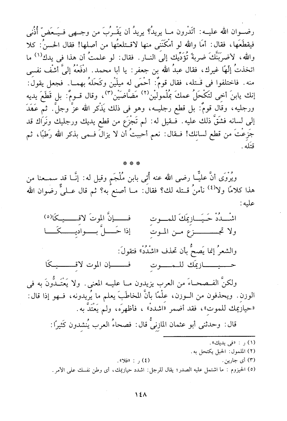 رضوان الله عليه: أتدرون ما يريد? يريد أن يقرب من وجهي فيعض أذني فيقطعها، فقال: أما والله لو أمكنني منها لاقتلعتها من أصلها! فقال الحسن: كلا والله. لأضربنك ضربة تؤديك إلى النار، فقال: لو علمت أن هذا في يدك1 ما اتخذت إلهاً غيرك، فقال عبد الله بن جعفر: يا أبا محمد، ادفعه إلي أشف نفسي إنك يا ابن أخي لتكحل عمك بملمولين2 مضاضين3، وقال قوم: بل قطع يديه ورجليه، وقال قوم: بل قطع رجليه، وهو في ذلك يذكر الله عز وجل. ثم عمد إلى لسانه فشق ذلك عليه، فقيل له: لم تجزع من قطع يديك ورجليك ونراك قد جزعت من قطع لسانك! فقال: نعم، أحببت أن لا يزال فمي يذكر الله رطباً، ثم قتله.