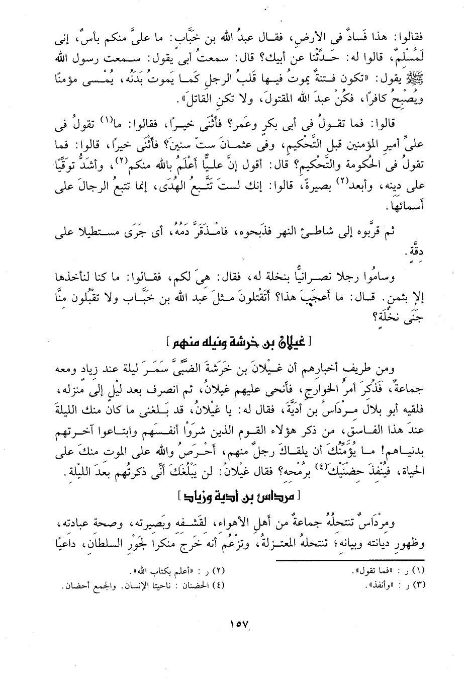 ومن طريف أخبارهم أن غيلان بن خرشة الضبي سمر ليلة عند زياد ومعه جماعة، فذكر أمر الخوارج، فأنحى عليهم غيلان، ثم انصرف بعد ليل إلى منزله فلقيه أبو بلال مرداس بن أدية. فقال له: يا غيلان، قد بلغني ما كان منك الليلة عند هذا الفاسق، من ذكر هؤلاء القوم الذين شروا أنفسهم وابتاعوا آخرتهم بدنياهم! ما يؤمنك أن يلقاك رجل منهم، أحرص والله على الموت منك على الحياة، فينفذ حضنيك1 برمحه? فقال غيلان: لن يبلغك أني ذكرتهم بعد الليلة.