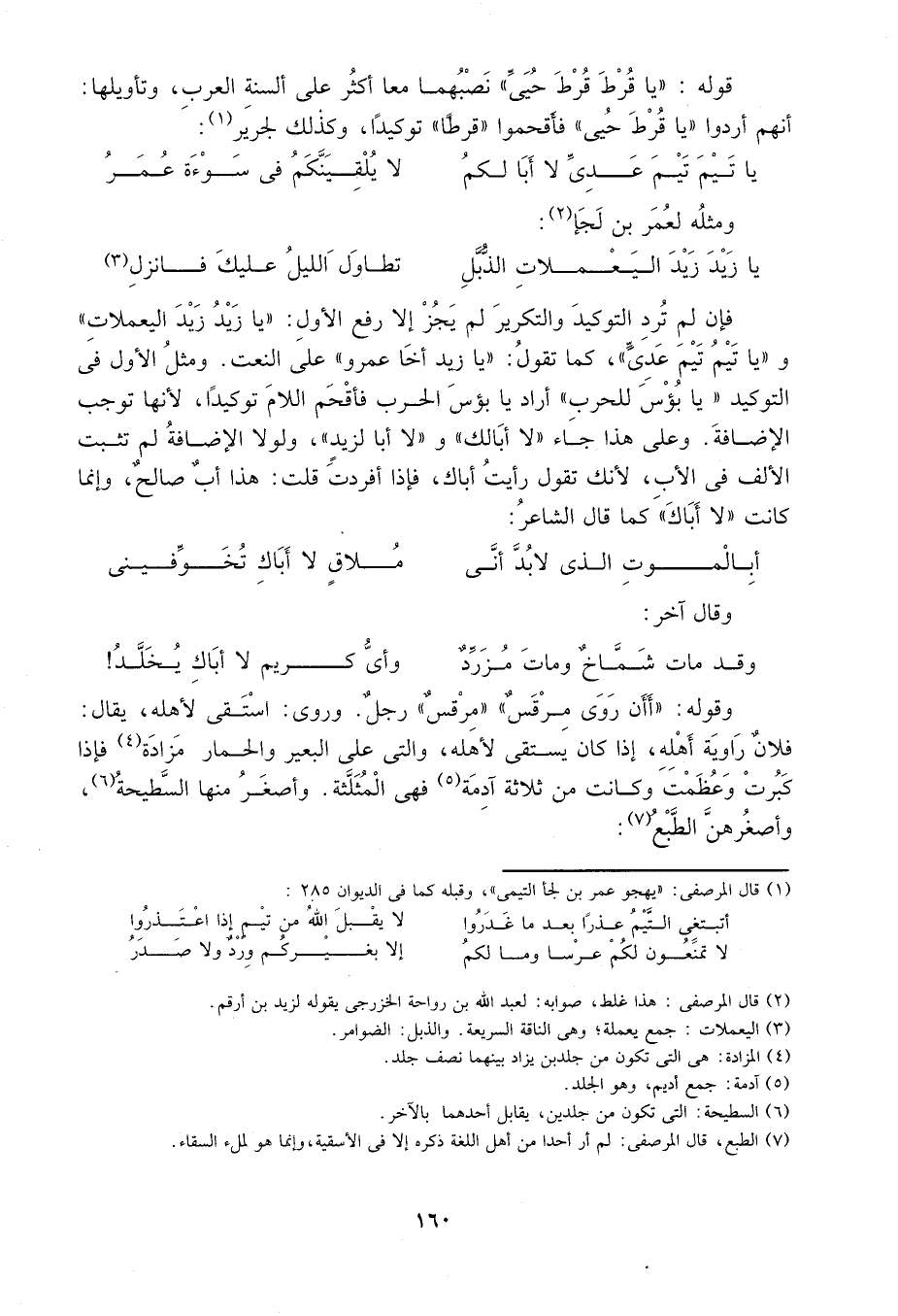 فإن لم ترد التوكيد والتكرير لم يجز إلا رفع الأول: "يا زيد زيد اليعملات" و"يا تيم تيم عدي"، كما تقول: "يا زيد أخا عمرو" على النعت. ومثل الأول في التوكيد "يا بؤس للحرب" فأقحم اللام توكيداً، لأنها توجب الإضافة. وعلى هذا جاء "لا أبالك" و"لا أبا لزيد" ولولا الإضافة لم تثبت الألف في الأب؛ لأنك تقول؛ رأيت أباك، فإذا أفردت: هذا أب صالح، وإنما كانت "لا أباك" كما قال الشاعر: