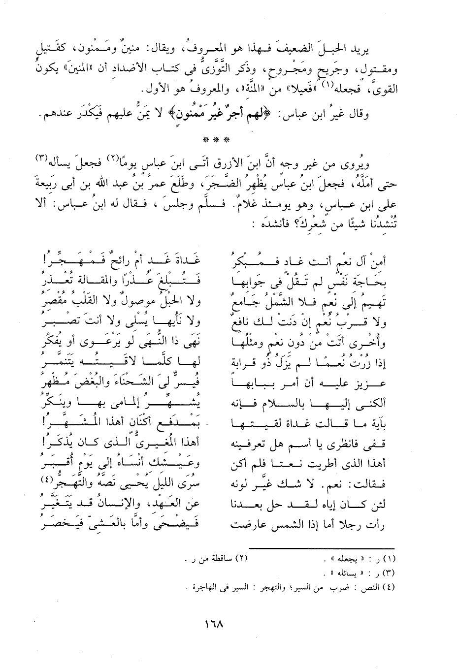 ويروى من غير وجه أن ابن الأزرق أتى ابن عباس يوماً2 فجعل يسأله3 حتى أمله، فجعل ابن عباس يظهر الضجر، وطلع عمر بن عبد الله بن أبي ربيعة على ابن عباس، وهو يومئذ غلام، فسلم وجلس، فقال له ابن عباس: ألا تنشدنا شيئاً من شعرك? فأنشده: