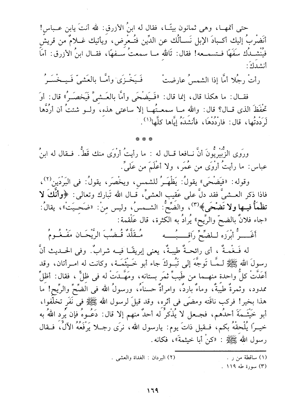 حتى أتمها، وهي ثمانون بيتاً، فقال له ابن الأزرق: لله أنت يا ابن عباس! أنضرب إليك أكباد الإبل نسألك عن الدين فتعرض، ويأتيك غلام من قريش فينشدك سفهاً فتسمعه! فقال: تالله ما سمعت سفهاً، فال ابن الأزرق: أما أنشدك: