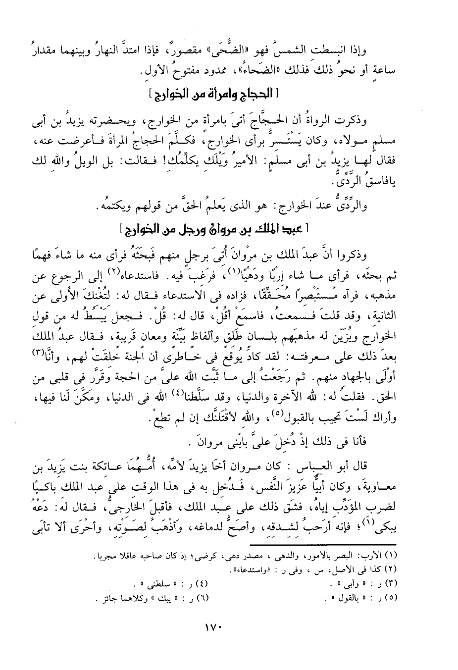 وذكروا أن عبد الملك بن مروان أتي برجل منهم فبحثه فرأى منه ما شاء فهماً ثم بحثه، فرأى ما شاء إبراً ودهياً1، فرغب فيه، فاستدعاه2 إلى الرجوع عن مذهبه، فرآه مستبصراً محققاً، فزاده في الإستدعاء فقال له: لتغنك الأولى عن الثانية، وقد قلت فسمعت، فاسمع أقل، قال له: قل. فجعل يبسط له من قول الخوارج ويزين له مذهبهم بلسان طلق وألفاظ بينة ومعان قريبة، فقال عبد الملك بعد ذلك على معرفته: لقد كان يوقع في خاطري أن الجنة خلقت لهم، وأنا3 أولى بالجهاد منهم. ثم رجعت إلى ما ثبت الله علي من الحجة وقرر في قلبي من الحق. فقلت له: لله الآخرة والدنيا، وقد سلطنا4 الله في الدنيا، ومكن لنا فيها، وأراك لست تجيب بالقبول5، والله لأقتلنك إن لم تطع.