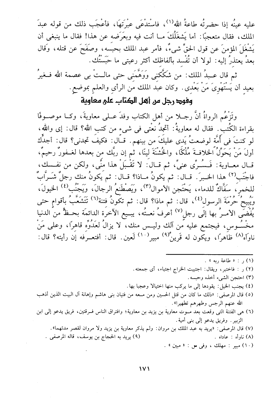 وتزعم الرواة أن رجلاً من أهل الكتاب وفد على معاوية، وكان موصوفاً بقراءة الكتب، فقال له معاوية: أتجد نعتي في شيء من كتب الله? قال: إي والله، لو كنت في أمة لوضعت يدي عليك من بينهم. قال: فكيف تجدني? قال: أجدك أول من يحول الخلافة ملكاً، والخشنة ليناً، ثم إن ربك من بعدها لغفور رحيم، قال معاوية: فسري عني، ثم قال: لا تقبل هذا مني، ولكن من نفسك، فاجتب1 هذا الخبر. قال: ثم يكون ماذا? قال: ثم يكون منك رجل شراب للخمر، سفاك للدماء، يحتجن الأموال2، ويصطنع الرجال، ويجنب3 الخيول، ويبيح حرمة الرسول4، قال: ثم ماذا? قال: ثم تكون فتنة5 تتشعب بأقوام حتى يفضى الأمر بها إلى رجل أعرف نعته6، يبيع الآخرة الدائمة بحظ من الدنيا مخسوس، فيجتمع عليه من آلك وليس منك، لا يزال لعدوه قاهراً، وعلى من ناوأه7 ظاهراً، ويكون له قرين8 مبير9 لعين قال: أفتعرفه إن رأيته? قال: