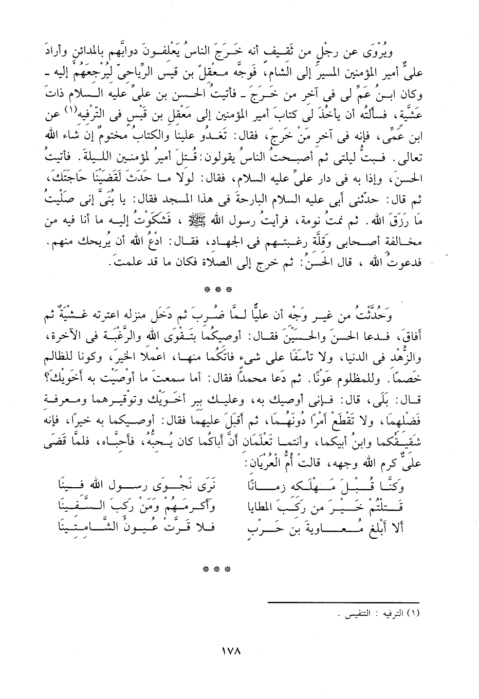 ويروى عن رجل من ثقيف أنه خرج الناس يعلفون دوابهم بالمدائن، وأراد علي أمير المؤمنين المسير إلى الشأم، فوجه معقل بن قيس الرياحي ليرجعهم إليه، وكان ابن عم لي في آخر من خرج فأتيت الحسن بن علي عليه السلام ذات عشية، فسألته أن يأخذ لي كتاب أمير المؤمنين إلى معقل بن قيس في الترفيه1 عن ابن عمي، فإنه في آخر من خرج، فقال: تغدو علينا والكتاب مختوم إن شاء الله تعالى، فبت ليلتي ثم أصبحت والناس يقولون: قتل أمير المؤمنين الليلة، فأتيت الحسن، وإذا به في دار علي عليه السلام، فقال: لولا ما حدث لقضينا حاجتك، ثم قال: حدثني أبي عليه السلام البارحة في هذا المسجد فقال: يا بني، إني صليت ما رزق الله، ثم نمت نومة، فرأيت رسول الله صَلَّى اللَّهُ عَلَيْهِ وَسَلَّمَ، فشكوت إليه ما أنا فيه من مخالفة أصحابي وقلة رغبتهم في الجهاد، فقال: ادع الله أن يريحك منهم، فدعوت الله. قال الحسن:ثم خرج إلى الصلاة فكان ما قد علمت.