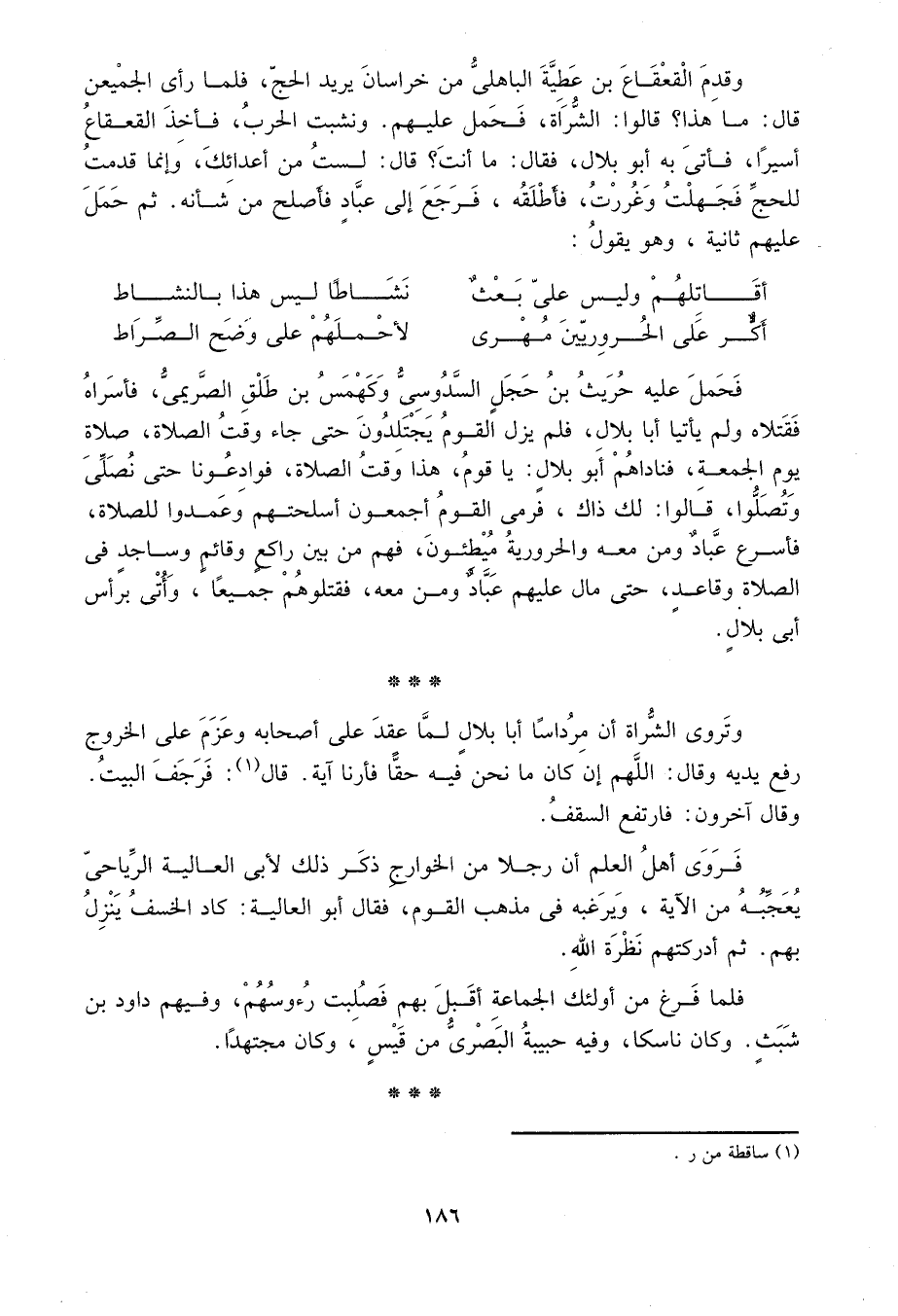 وقدم القعقاع بن الباهلي من خراسان يريد الحج. فلما رأى الجمعين قال: ما هذا? قالوا: الشراة. فحمل عليهم. ونشبت الحرب، فأخذ القعقاع أسيراً، فأتي به بلال، فقال: ما أنت? قال: لست من أعدائك، وإنما قدمت للحج فجهلت وغررت، فأطلقه، فرجع إلى عباد فأصلح من شأنه. ثم حمل عليهم ثانية، وهو يقول: