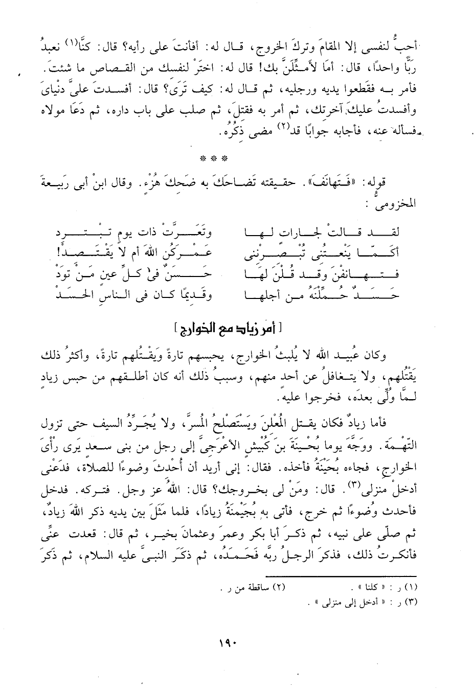 فأما زياد فكان يقتل المعلن ويستصلح المسر، ولا يجرد السيف حتى تزول التهمة. ووجه يوماً بحينة بن كبيش الأعرجي إلى رجل من بني سعد يرى رأي الخوارج، فجاءه بحينة فأخذه. فقال: إني أريد أن أحدث وضوءاً للصلاة، فدعني أدخل منزلي1. قال: ومن لي بخروجك? قال: الله عز وجل، فتركه. فدخل فأحدث وضوءاً ثم خرج، فأتى به بحينة زياداً. فلما مثل بين يديه ذكر الله زياد، ثم صلى على نبيه، ثم ذكر