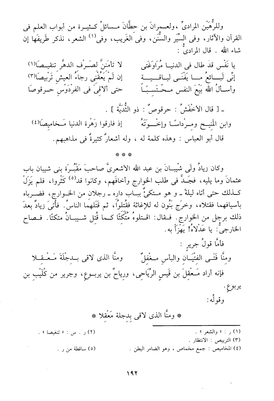 وللرهين المرادي، ولعمران بن حطان مسائل كثيرة من أبواب العلم في القرآن والآثار، وفي السير والسنن، وفي الغريب، وفي1 الشعر، نذكر طريفها إن شاء الله. قال المرادي: