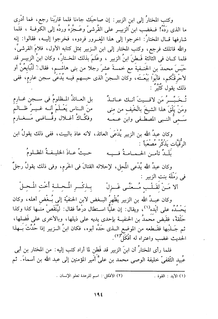 وكان عبد الله بن الزبير يظهر البغض لابن الحنفية إلى بغض أهله، وكان يحسده على أيده1، ويقال: إن علياً استطال درعاً فقال: لينقص منها كذا وكذا حلقة، فقبض محمد بن الحنفية بإحدى يديه على ذيلها، وبالأخرى على فضلها، ثم جذبها فقطعه من الموضع الذي حده أبوه، فكان ابن الزبير إذا حدث بهذا الحديث غضب واعتراه له أفكل2.