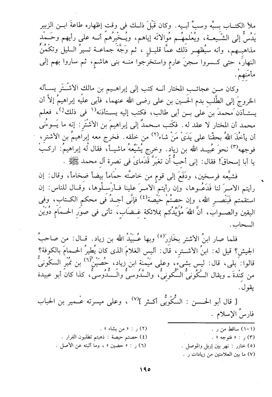 وكان من عجائب المختار أنه كتب إلى إبراهيم بن مالك الأشتر يسأله الخروج إلى الطلب بدم الحسين بن علي رضي الله عنهما، فأبى عليه إبراهيم إلا أن يستأذن محمد بن علي بن أبي طالب، فكتب إليه يستأذنه في ذلك1، فعلم محمد أن المختار لا عقد له، فكتب محمد إلى إبراهيم بن الأشتر: إنه ما يسوؤني أن يأخذ الله لحقنا على يدي من شاء2 من خلقه. فخرج معه إبراهيم بن الأشتر، فوجهه3 نحو عبيد الله بن زياد. وخرج يشيعه ماشياً، فقال له إبراهيم: اركب يا أبا إسحاق! فقال: إني أحب أن تغبر قدماي في نصرة آل محمد صَلَّى اللَّهُ عَلَيْهِ وَسَلَّمَ.