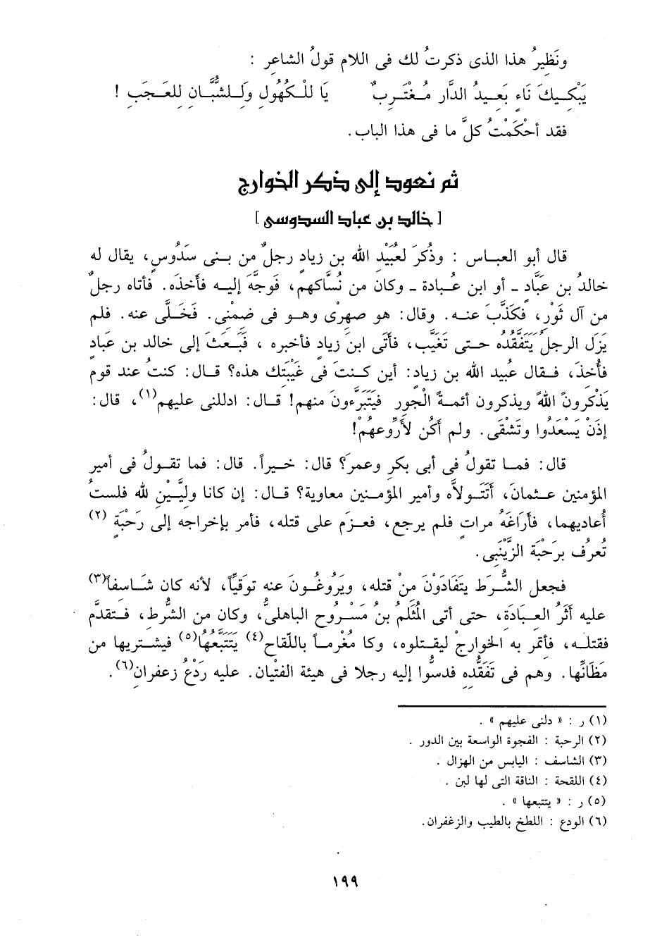 قال أبو العباس: وذكر لعبد الله بن زياد رجل من بني سدوسي، يقال له خالد بن عباد - أو ابن عبادة - وكان من نساكهم، فوجه إليه فأخذه، فأتاه رجل من آل ثور، فكذب عنه، وقال: هو صهري وهو في ضمني، فخلى عنه، فلم يزل الرجل يتفقده حتى تغيب، فأتى ابن زياد فأخبره، فبعث إلى خالد بن عباد فأخذ، فقال عبيد الله بن زياد: أين كنت في غيبتك هذه? قال: كنت عند قوم يذكرون الله ويذكرون أئمة الجور فيتبرأون منهم! قال: ادللني عليهم1، قال: إذن يسعدوا وتشقى، ولم أكن لأروعهم! قال: فما تقول في أبي بكر وعمر? خيراً، قال: أمير المؤمنين عثمان، أتتولاه وأمير المؤمنين معاوية? قال: إن كانا وليين لله فلست أعاديهما، فأراغه مرات فلم يرجع، فعزم على قتله، فأمر بإخراجه إلى رحبة2 تعرف برحبة الزينبي.