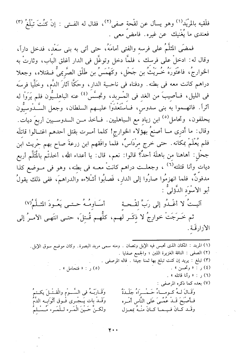 فمضى المثلم على فرسه والفتى أمامه، حتى أتى به بني سعد، فدخل داراً، وقال له: ادخل على فرسك، فلما دخل وتوغل في الدار أغلق الباب، وثارت به الخوارج فاعتوره حريث بن حجل، وكهمس بن طلق الصريمي فقتلاه، وجعلا دراهم كانت معه في بطنه، ودفناه في ناحية الدار، وحكا آثار الدم، وخليا فرسه في الليل، فأصيب من الغد في المربد، وتجسس4 عنه الباهليون فلم يروا له أثراً، فاتهموا به بني سدوس، فاستدوا عليهم السلطان، وجعل السدوسيون يحلفون، وتحامل5 ابن زياد مع الباهليين، فأخذ من السدوسيين أربع ديات، وقال: ما أدري ما أصنع بهؤلاء الخوارج! كلما أمرت بقتل واحد منهم اغتالوا قاتله فلم يعلم بمكانه، حتى خرج مرداس، فلما واقفهم ابن زرعة الكلابي صاح بهم حريث بن حجل: أههنا من بالهة أحد? قالوا: نعم، قال: يا أعداء الله، أخذتم بالمثلم أربع ديات وأنا قتلته6 وجعلت دراهم كانت معه في بطنه، وهو في موضع كذا مدفون، فلما انهزموا صاروا إلى الدار، فصابوا أشلاءه والدراهم، ففي ذلك يقول أبو الأسود الدؤلي: