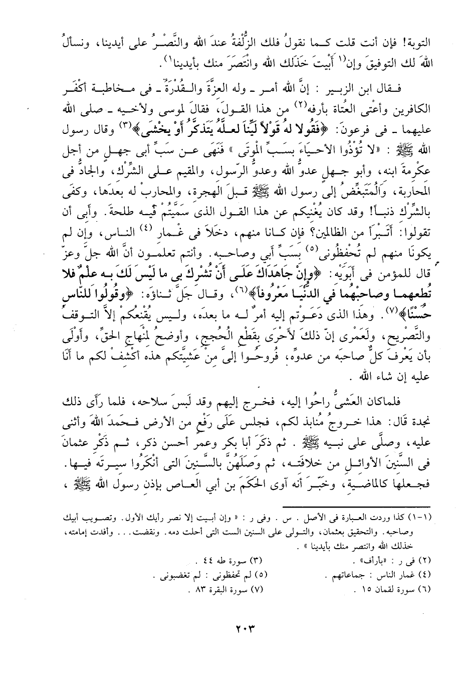 فقال ابن الزبير: إن الله أمر - وله العزة والقدرة - في مخاطبة أكفر الكافرين وأعتى العتاة بأرفه2 من هذا القول، فقال لموسى ولأخيه - صلى الله عليهما - في فرعون: {فَقُولا لَهُ قَوْلاً لَيِّناً لَعَلَّهُ يَتَذَكَّرُ أَوْ يَخْشَى} 3، وقال رسول الله صَلَّى اللَّهُ عَلَيْهِ وَسَلَّمَ: "لا تؤذوا الأحياء بسب الموتى" فنهى عن سب أبي جهل من أجل عكرمة ابنه، وأبو جهل عدو الله وعدو الرسول، والمقيم على الشرك، والجاد في المحاربة، والمتبغض إلى رسول الله صَلَّى اللَّهُ عَلَيْهِ وَسَلَّمَ قبل الهجرة، والمحارب له بعدها، وكفى بالشرك ذنباً! وقد كان يغنيكم عن هذا القول الذي سميتم فيه طلحة وأبي، أن تقولوا: أتبرأ من الظالمين? فإن كانا منهم، دخلا في غمار4 الناس، وإن لم يكونا منهم لم تحفظوني5 بسب أبي وصاحبه، وأنتم تعلمون أن الله جل وعز قال للمؤمن في أبويه: {وَإِنْ جَاهَدَاكَ عَلَى أَنْ تُشْرِكَ بِي مَا لَيْسَ لَكَ بِهِ عِلْمٌ فَلا تُطِعْهُمَا وَصَاحِبْهُمَا فِي الدُّنْيَا مَعْرُوفاً} 6, وقال جل ثناؤه: {وَقُولُوا لِلنَّاسِ حُسْناً} 7. وهذا الذي دعوتم إليه أمر له ما بعده، وليس يقنعكم إلا التوقيف والتصريح، ولعمري إن ذلك لأحرى بقطع الحجج، وأوضح لمنهاج الحق، وأولى بأن يعرف كل صاحبه من عدوه، فروحوا إلي من عشيتكم هذه أكشف لكم ما أنا عليه إن شاء الله.